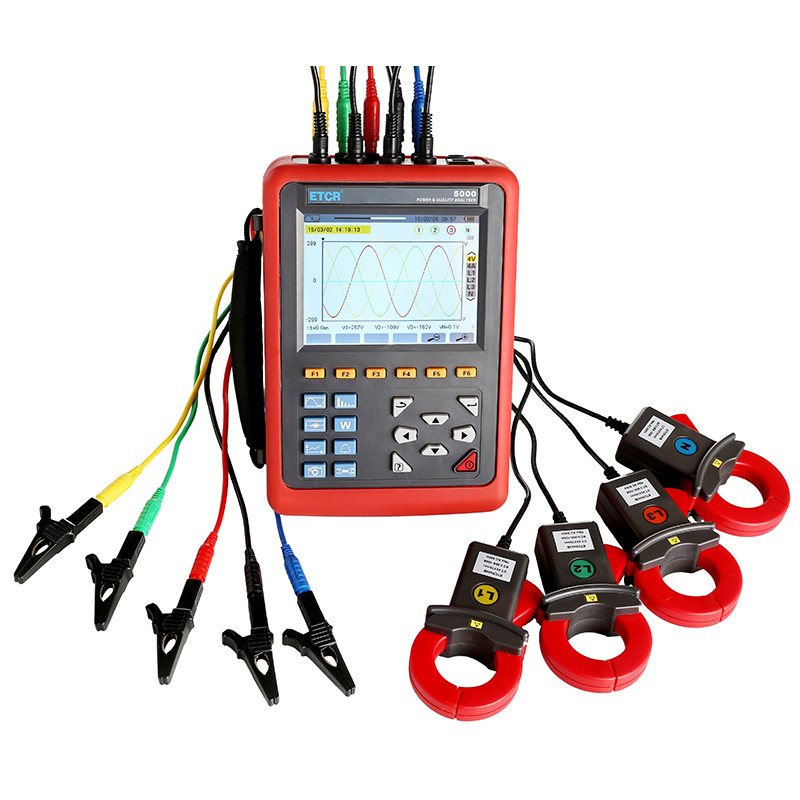 ETCR5000电能质量分析仪是我公司精心研制的一款专为现场测试的三相、多功能、智能化、人机操作简洁的综合型测试仪器。具有容易使用,超大液晶彩屏显示,高分辨率,中英文双语操...ETCR5000电能质量分析仪是我公司精心研制的一款专为现场测试的三相、多功能、智能化、人机操作简洁的综合型测试仪器。具有容易使用,超大液晶彩屏显示,高分辨率,中英文双语操作界面,防振结构外壳等特点。可同时测量4路电流(ABC三相及中性线电流),4路电压(ABC三相电压及中性线对地电压)、电流电压的峰值、一段时间内的蕞大蕞小值、三相不平衡度、短时电压闪变、变压器K因数、有功功率、无功功率、视在功率、功率因数、位移功率因数、有功电能、无功电能、视在电能、谐波比、总谐波失真度等;显示电流电压的实时波形、相量图、谐波比柱形图;动态捕捉电压电流瞬时变化,监测启动电流,监测各电力参数并生成告警列表,长时间记录测试数据并生成趋势曲线图等功能。