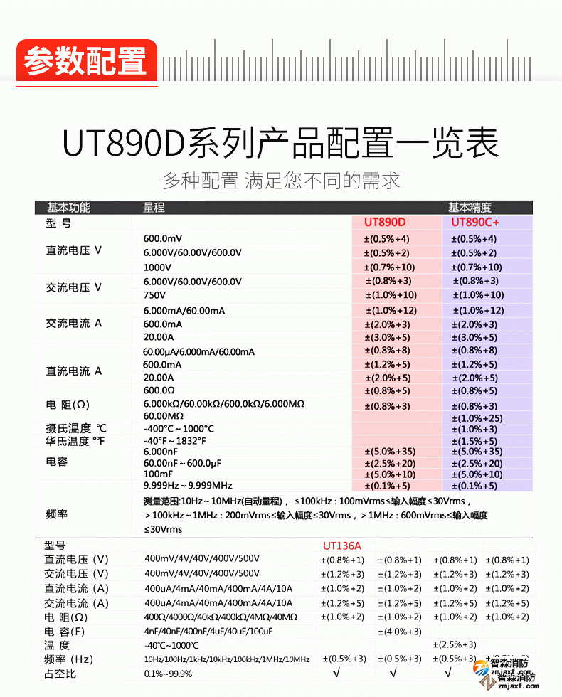 | 标准配件 | 表笔、电池、温度探头 (仅UT890C+) | ||